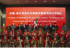 中意合作支持北京中国文化遗产研究院文物?;ば薷磁嘌迪钅?,是中意两国政府为增进国际友谊,促进双方在“文化遗产?;ぁ绷煊虻暮献饔虢涣?,开展的科学技术合作。项目按照金属、陶瓷器、石质、考古现场?;に母鲎ㄒ捣较蚩沽宋?个月的教学。教学中采用理论和实践相结合的教学模式,注重于多学科在现代文物?;ば薷粗械慕徊嫒诤?。两期中意合作项目建立和完善了培训中心的软硬件环境,通过中意双方教员、全体学员和工作人员的共同努力,对来自全国27个省市自治区的129名学员进行了专业技术培训。先后出版了《文物修复理论》、《文物?;び胄薷吹奈侍狻?、《文化遗产?;ぴ谥泄返冉滩慕惨?。项目获得商务部“双边多边政府合作项目管理优秀奖”。在项目期内还举办了“故宫文物?;ば薷醋ㄒ导际跞嗽迸嘌蛋唷?,对来自故宫博物院的14名?;ば薷醇际跞嗽苯辛俗ㄌ馀嘌⑴浜弦獯罄蘼硇薷粗行牡淖液图际跞嗽惫餐怨使偷罱惺匝樾跃植啃薷?,在实践中检验并丰富了学习成果。2009年中意双方再度合作举办了“激光清洗技术在文物?;ば薷粗械挠τ门嘌蛋唷保馐枪谑状谓す馇逑醇际跻胛奈锉;ば薷戳煊颍竦昧肆己玫氖导Ч?。