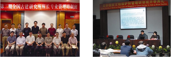 二、全国古建研究所(所长)?;ぶ行模ㄖ魅危┳ㄒ倒芾砼嘌蛋啵ǖ谝弧⒍冢?br> 于2003年、2004年先后举办的两期全国古建研究所(所长)?;ぶ行模ㄖ魅危┳ㄒ倒芾砼嘌蛋啵醋匀鞲鍪?、自治区、直辖市的36名省级管理干部开展了研讨式培训。培训班侧重于专业技术和行政管理,以政治理论、政策法规、行政管理、综合业务等为主要内容安排授课。采取专题报告、文保论坛、现场教学、考察实习、毕业考核等多形式的教学模式进行教学。编辑出版了首届《全国文物古建研究所培训班讲义》。