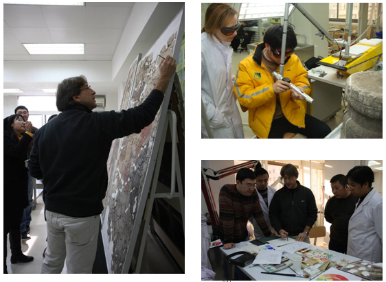 1、中意合作文物?;ば薷聪钅?br> 中意合作文物保护修复培训项目是意大利外交部发展合作司与我国商务部、国家文物局通过资金和技术无偿援助的形式合作实施的培训项目,在中国文化遗产研究院建设壁画、纸张、纺织物?;ば薷春涂蒲Ъ觳?个实验室。截至2009年底,已成功举办两期,完成论文整理和资料编辑、实验室建设(包括红外紫外视频系统、激光清洗机及修复设备等在内的第三批意大利援助设备在2008年底运抵我院,2009年2月前完成安装、调试及人员培训工作。),举办“激光清洗技术在无机质文物?;ば薷粗械挠τ谩迸嘌蛋?、“天衣有缝-古代纺织品文物修复学术研讨会”及“中国古代纺织品修复成果展”等。专业科研人员的教育培训成绩突出,受到国家文物局、商务部、意大利外交部、意大利文化遗产部等部门有关领导的高度重视,予以了高度评价。