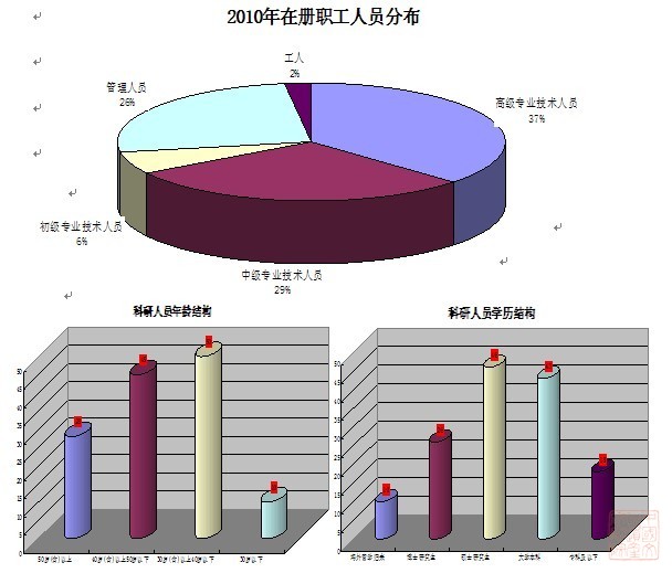 一、人员概况 2010年,我院在册职工共133人,其中具有研究生以上学历72人(其中博士26人,硕士46人),具有高级专业技术职称58人(其中正高级专业技术职称13人,副高级专业技术职称45人)。专业人员涉及自然科学、工程技术科学、人文社会科学等部类,遍布42个学科。专业人员当中50岁(含)以上25人,40岁(含)以上、50岁以下47人,30岁(含)以上、40岁以下50人,30岁以下11人,人员年龄结构、知识结构渐趋合理。2010年底,完成了首次岗位聘用工作,全院人员已经聘用到相应岗位。