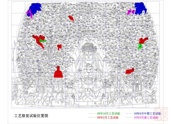 一、重庆大足千手观音造像抢救性?;すこ糖捌诘鞑橛胙芯渴笛?br> 根据国家文物局的要求,受重庆大足石刻艺术博物馆委托,我院牵头组织了大足石刻千手观音造像抢救性保护工程的前期调查评估和实验研究。截至2009年底,在制订详细工作方案的基础上,完成了千手观音保存现状的调查评估与试验研究,保护工程工艺修复试验和大漆以及传统漆工艺试验研究等工作。 2010年,完成了针对大足千手观音的彩绘和金箔抢救性加固前期试验,千手观音雕像岩石、金箔、彩绘风化病害破坏机理研究,风化砂岩渗透加固保护材料试验,岩土体工程地质详细勘察,贴金工艺研究与修复试验,雕刻岩体稳定性测试与评估进度,千手观音环境监测前期研究等项目子课题的研究,并依照中期目标完成了报告汇总工作。6月29日,通过重庆市文物局组织的中期论证会审议。同时还完成总体工作方案,完善了基于近景摄影测量的高清晰图件制作等项工作。针对小面积试验区开展的现场修复试验也取得了良好收效。