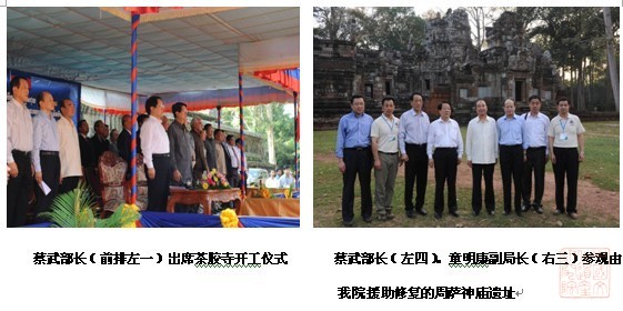 三、援助柬埔寨吴哥古迹茶胶寺?;すこ?br> 根据中柬两国政府《中柬两国政府双边合作文件》、《中华人民共和国国家文物局与柬埔寨王国吴哥文物局关于加强文物?;ず献鞯牧陆獗竿肌泛汀吨谢嗣窆埠凸椅奈锞钟爰砥艺豕飧缥奈锞止赜诒;の飧绻偶6谙钅康男椤罚杞核卤;ず托薷垂こ陶搅形矶谖飧绻偶1;は钅?。受国家文物局委托,我院作为中国政府援助柬埔寨吴哥古迹保护修复工程的执行机构,承担了茶胶寺保护和修复工程。 2010年,我院正式提交了茶胶寺八座单体建筑的保护设计方案,并通过专家论证,同时完成了茶胶寺保护工程总体研究报告,并提交吴哥古迹?;ば魑被幔↖CC)和柬埔寨政府,总体研究报告获得了ICC批准和专家们的较高评价,获得柬埔寨吴哥文物局的施工许可,为下一阶段保护工程的实施提供了先决条件。 2010年11月27日,举行了茶胶寺?;すこ痰目さ淅?,柬埔寨王国政府宋安副首相、中国文化部蔡武部长、国家文物局童明康副局长出席开工典礼。