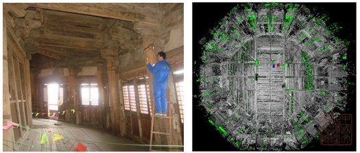 六、应县木塔现状信息系统建设和二期监测 受山西应县人民政府委托,自2008年起,我院承担了应县木塔整体保养性维修与监测方案设计、应县木塔监测系统设计与实施、应县木塔保养维修工程监理与技术指导等项目。 2010年,完成了应县木塔现状信息系统建设第一阶段工作,第二阶段的数据采集工作进展顺利,建立了数据库后台管理系统,其中包括整体结构变形监测基准体系建设、二层明层现状三维空间结构精确化激光扫描与绘图、应县木塔风压系数现场实测与分析等内容。同时,对院落积水与台明险情进行了初步勘察,并积极协调应县文物局开展详细勘察和?;ど杓品矫娴墓ぷ?。