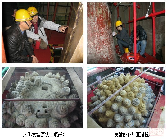 十四、潼南大佛本体?;ば薷垂こ?br> 受潼南县大佛寺景区开发建设有限责任公司委托,我院承担了潼南大佛?;ば薷垂こ?。自2010年9月25日开工以来,各项工作按照工作计划积极推进。潼南大佛头部(面部和发髻)的?;ば薷垂ぷ魉忱?,大佛躯干部分?;ば薷吹牡谝唤锥位救コ捅砻媲逑垂ぷ魍逼舳T谙殖〗械慕鸩胰?、回贴等试验取得了阶段性成果。