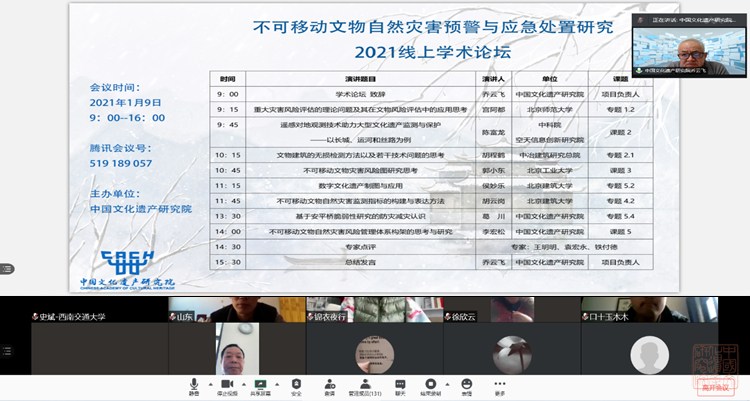 2021年1月9日,中国文化遗产研究院举办“不可移动文物自然灾害风险评估与应急处置研究—2021线上学术论坛”。本次学术论坛立足国家“十三五”——不可移动文物自然灾害风险评估与应急处置研究重点研发专项,共邀请了来自北京师范大学、北京工业大学、北京建筑大学、中科院空天信息创新研究院、中冶建筑研究总院和中国文化遗产研究院6家单位的8位不同领域专业人员,探讨了不同学科下新技术、新理论、新方法在文物科学?;び敕涝旨踉种械挠τ谩B厶程乇鹧肓斯也┪锕萏兜卵芯抗菰?、北京化工大学王明明教授和清华大学袁宏永教授作为点评专家出席。本次学术论坛有200余人参加。