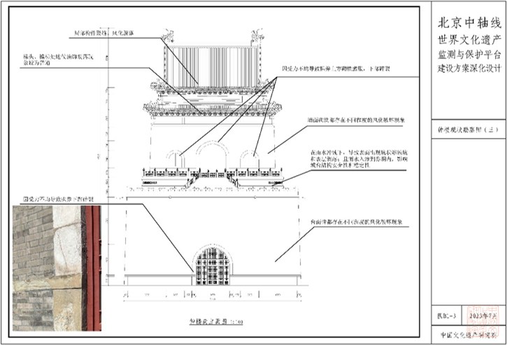 以钟鼓楼为例,进行病害勘察、总结主要破坏因素和现存主要问题,其中包括鼓楼二层平座整体外闪、沉降,平座结构拔榫,钟楼南北立面部分砌块竖向和斜向裂缝等情况,以及地铁震动、暴雨等有直接影响的破坏因素。 根据上述本体勘察以及现状评估结果,参照中国世界文化遗产监测预警总平台要求的监测指标体系,按照病害严重程度和因素影响方式,进一步分类确定监测方法、监测指标、数据形式与采集方法、数据规则、监测周期等,并根据监测指标体系,分为三种具体监测方式。 ?。ㄒ唬┳ㄏ罴嗖猓ǘㄆ诮峁辜觳猓?br> 针对程度较重、影响较大的病害,采取专项监测措施。以钟鼓楼为例,针对平座整体歪闪、拔隼的情况,委托专业机构每年开展一次专项结构检测,采集技术数据,进行对比分析,得出评估结论。 ?。ǘ┲氐慵嗖猓ò沧凹嗖馍璞福?br> 针对程度较为严重的裂缝、渗漏等病害开展重点监测,安装设备自动化监测,密切关注病害发展情况。如钟鼓楼受到地铁震动影响,梁柱变形隐患较大,通过在鼓楼屋架内安装倾角仪等监测设备,自动收集监测数据,定期分析评估,及时掌握地铁震动影响。 ?。ㄈ┏9婕嗖猓ㄈ斯と粘Q膊椋?br> 针对程度一般的风化、裂缝等病害开展常规监测,采用人工定期巡查,将监测数据录入监测系统中,密切关注病害发展情况。以钟鼓楼为例,针对钟楼立面部分砌块风化破碎的情况,每季度开展定点拍照记录病害变化情况,定期分析评估。 此外,针对受到降雨影响的积水、渗漏等病害,开展降雨响应监测,在降雨过程中、降雨后,向相关管理机构推送巡查任务,站定点拍照记录,将积水、渗漏等病害情况录入监测系统中。