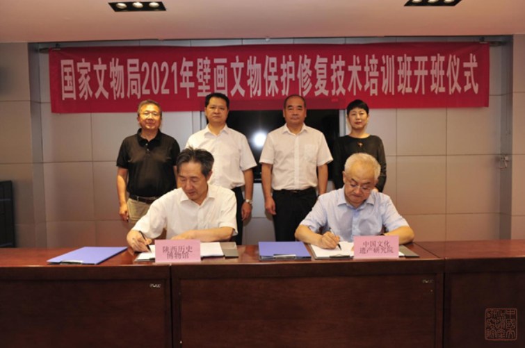 7月15日,由国家文物局委托,我院承办,陕西历史博物馆协办的“2021年度壁画文物?;ば薷醇际跖嘌蛋唷痹谏挛骼凡┪锕菘?。中国文化遗产研究院副院长乔云飞、陕西历史博物馆党委书记、馆长侯宁彬、副馆长程旭、“馆藏壁画?;ば薷从氩牧峡蒲а芯俊惫椅奈锞种氐憧蒲谢刂魅温分怯碌攘斓汲鱿丝嘁鞘健?br> 侯宁彬馆长首先对培训班的开班表示祝贺,对各位学员的到来表示欢迎。他指出,古代壁画作为我国优秀的历史文化资源,是真实反映古代历史、文化、艺术信息的重要载体,但馆藏壁画面临着系列的保存、?;?、修复和展示技术难题。因此,举办此次培训班非常必要。中国文化遗产研究院作为文化遗产?;た蒲а芯炕刽吖椅奈锞峙嘌奈锉;ば薷纯萍己图寄苋瞬诺闹匾嘌凳痉痘?,与陕西历史博物馆暨“馆藏壁画保护修复与材料科学研究”国家文物局重点科研基地共同举办的此次培训,一定能够在课程设置、教学安排、实践训练及了解壁画?;ば录际?、新材料等诸多方面取得很好的培训效果。 乔云飞副院长表示我院的专业培训致力于解决文博行业重点发展领域的人才短缺问题,以及如何更好为文物?;な导嘌婢哐芯?、设计、施工与管理等综合能力的人才问题。同时作为国家级科研院所,我们还致力于在人才培养层面,与各地方开展合作,以便更有针对性地为地方培养急需人才,并通过具体的文物?;な导俳滩诤稀1敬斡肷挛骼凡┪锕莺献骺古嘌?,更多的是将希望能将大家带入实践的真实场景中,在开展专业学习、专业交流的同时,增强专业思考与专业实践能力,并在实践课程中,加强科学分析与研究总结,形成较为丰富的教学成果。 本次培训班面向全国招生,最终录取来自14个?。ㄊ?、自治区)的20名学员,将完成92课时的理论学习、现场实践与交流研讨,通过理论学习提高学员对壁画的保护修复技术和理论知识,完成具体壁画文物的?;ば薷词笛槿挝?,促进专业能力提升。 开班仪式后,我院副院长乔云飞与陕西历史博物馆副馆长程旭分别代表双方签署了“文物科技?;び肴瞬排嘌献骺蚣苄椤薄8菪樵级?,双方将充分发挥在可移动文物保护修复、科学研究、展示利用、人才培养、国际交流合作等领域的专业优势,加强交流与协作,根据业务发展需要开展深入广泛合作;构建战略合作关系,共同促进业务发展与技术提升;建立有效的联合工作机制,推进业务合作高质量发展。