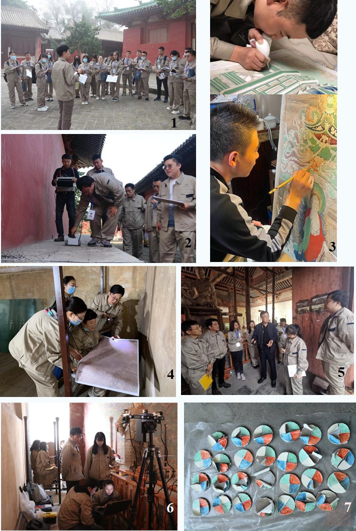 1现场工作布置2地质雷达探测3壁画复原4病害调查 5郭宏现场进行预防性?;そ萄?高光谱检测7材料性能试验