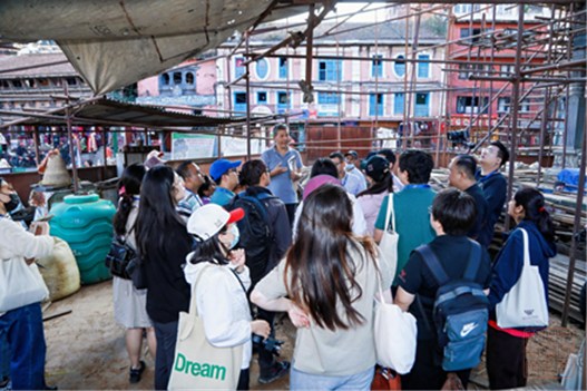 实践营期间,中尼专家团队带领学员们调研了加德满都谷地世界文化遗产的多个遗产地,包括博达哈大佛塔(Bouddhanath Stupa)、斯瓦扬布纳特佛塔(Swayambu Stupa)、帕斯帕提那神庙(Pashupatinath Temple)、加德满都杜巴广?。↘athmandu Durbar Square)九层神庙及周边历史建筑、帕坦杜巴广?。≒atan Dubar Square)及周边历史建筑等,学员们在实地中深入了解了遗产地的文化价值和?;ぷ纯?。在九层神庙修复项目现场,哈努曼多卡宫博物馆馆长Sandeep Khanal和尼泊尔考古局首席考古官 Ramesh Raj Paudel为实践营学员开展现场教学,分别介绍了多国参与的哈努曼多卡宫震后文化遗产修复与尼泊尔背景下的修复项目管理。